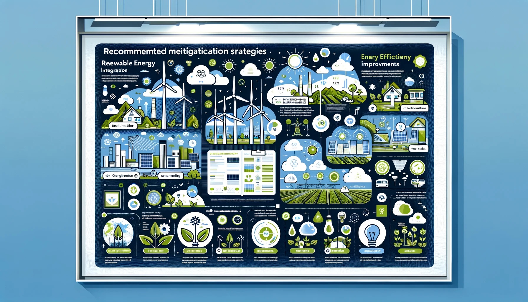 - Mitigation Strategy Recommendations: An infographic depicting various AI-recommended mitigation strategies such as renewable energy integration, energy efficiency improvements, and sustainable agricultural practices, illustrated with icons and concise descriptions.